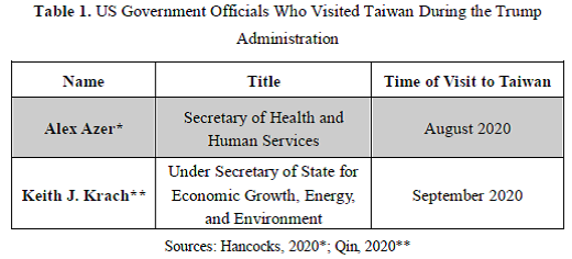 Enhancing political clarity in the US foreign policy also involves increasing the quantity and quality of bilateral exchanges between high-ranking officials from the United States and Taiwan. Notable instances of such exchanges began with the congratulatory telephone conversation between Tsai Ing-wen and Donald Trump following the latter's victory in the 2016 US presidential election. Table 1 lists US government officials who visited Taiwan during the Trump administration.