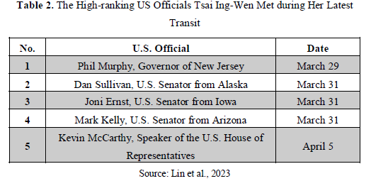 Tsai's meeting with then-house speaker Kevin McCarthy stands as a pinnacle in the history of bilateral interactions within the context of Taiwanese presidents’ transit trips through the United States. Table 2 lists the High-ranking US officials Tsai Ing-Wen met during her latest transit.