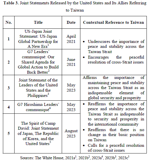 It is worth noting that the US-Japan joint statement, released during the visit of then-Japanese Prime Minister Suga Yoshihide to Washington in 2021, marked the first time since 1969 wherein the issue of Taiwan featured within the text of a Japanese-American joint statement. Similarly, the G7 Leaders' communiqué released upon the conclusion of the G7 summit in June 2021, also marked the first time wherein the G7 leaders collectively mentioned Taiwan within the context of their joint statement. Table 3 lists the joint statements released by the United States and its allies referring to Taiwan from 2021 to 2023.