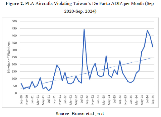 Meanwhile, the United States' transition away from traditional strategic ambiguity and its growing political commitment to Taiwan’s security have engendered a corresponding escalation in China's regional behavior and military activities within the Taiwan Strait. In 2022 alone, an alarming 1,700 Chinese aircrafts infiltrated Taiwan's airspace (Lostumbo, 2023). This display of military prowess heightened international concerns regarding the potential ramifications of a military crisis unfolding within the Taiwan Strait. Among the salient actions undertaken by the PLA during its naval exercises, the firing of nine ballistic missiles stood out prominently. Notably, five of these ballistic missiles made an unprecedented landing upon the waters within Japan's special economic zone, a development confirmed by Japanese officials (MOFA, 2022a). Figure 2 illustrates the number of PLA aircrafts violating Taiwan’s de-facto ADIZ per month from Sep. 2020 to Sep. 2024.