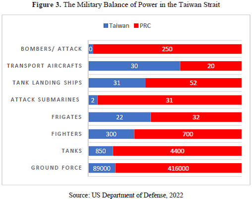 Within the neo-realist theoretical paradigm that underpins the balance of power theory, the ascent of a rising power inherently poses a security threat to others (Jervis, 1978). Consequently, the enhancement of a state's military capabilities in comparison to other state-actors serves as a catalyst prompting others to adopt a balancing behavior. Such behavior encompasses the proportional augmentation of economic and military capabilities as well as the development of multilateral security alliances (Waltz, 1997). Therefore, the security concerns and the subsequent balancing behavior exhibited by regional state-actors toward China's rise find their conceptual roots within Waltz's theoretical worldview, which underscores the maintenance of a regional balance of power as the primary objective of balancing. Figure 3 shows the military balance of power in the Taiwan Strait.