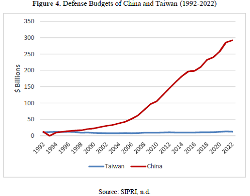Over the course of the past four decades, Taiwan has grappled with the challenge of maintaining a favorable balance of power vis-à-vis China. Owing to PRC's substantial investments in the PLA modernization, Taiwan has faced difficulties in upholding the cross-strait balance of power to its advantage. Official statistics indicate that in 2023 alone, China's defense budget surged to $224.79 billion, reflecting a year-on-year growth of 7.2% (Xinhua, 2023). If such figures hold true, China's defense expenditure would dwarf Taiwan’s by a magnitude of twelvefold. Figure 4 compares changes in defense budgets of China and Taiwan from 1992 to 2022.